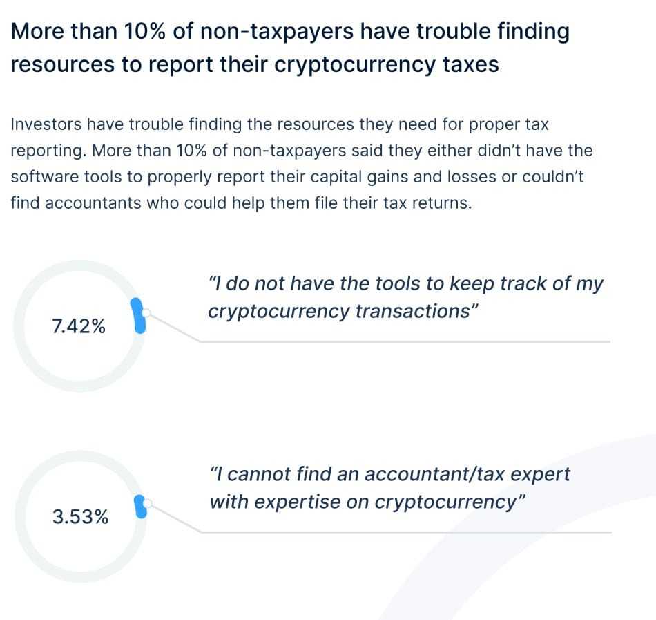 This one goes back to the unclear framework mentioned above and the lack of information available for crypto tax reporting. Over 10% of non-taxpayers stated that they had trouble finding the resources and tools to report their crypto taxes or couldn’t find any accountants who could help.