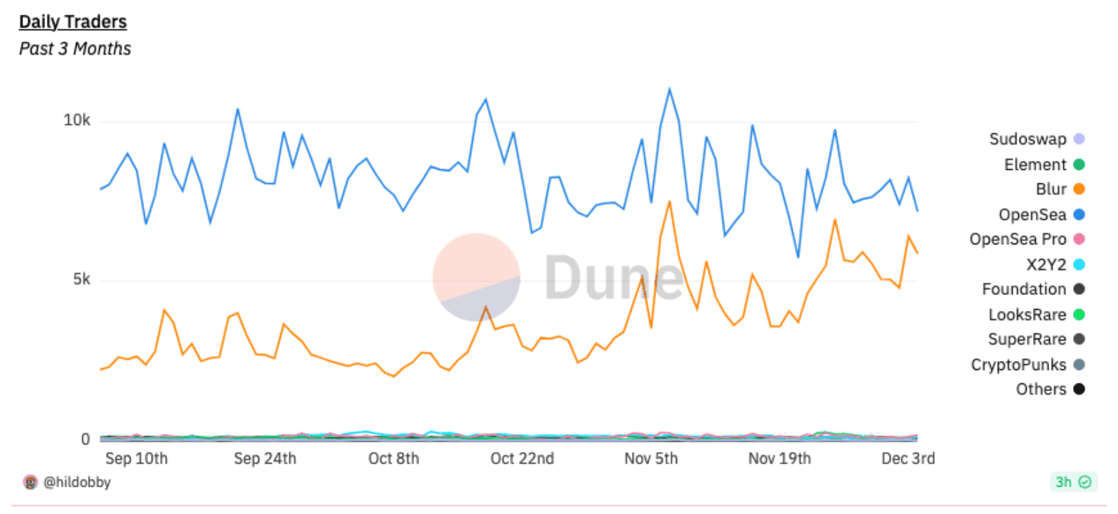 Shifts in Trading Platforms and Market Dynamics: A significant development in the NFT market has been the shift in trading volume from OpenSea to Blur. As of late 2023, Blur dominates almost 80% of the NFT trading volume, a dramatic rise from its inception in October 2022. This shift indicates changing preferences among NFT traders and collectors, favoring platforms that cater more to their needs. OpenSea, once the dominant marketplace, now holds around only 17% of the total NFT trading volume.