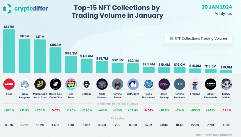 Azukis and Pudgy Penguins have emerged as dominant players in January's trading volume. Their continuous project updates and ecosystem growth have proven fruitful, causing both collections to surpass BAYC.