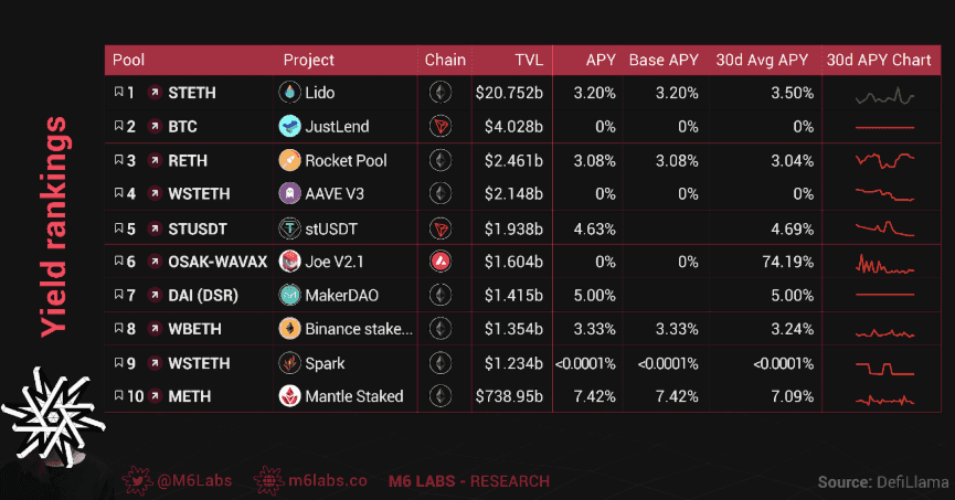 When reviewing the state of staking, there are some noteworthy observations. While many protocols have experienced decreases, Lido has shown positive developments. It's important for users to be aware of the yields offered by the leading protocols in the industry, which are outlined below.