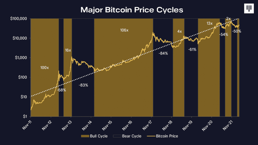 “While we’ve had two -80% bear markets already, I believe those are a thing of our primordial past. Future bear markets will be shallower. The previous two have been -61% and -54%. Unfortunately, there’s no free lunch. The flipside is we probably won’t see the 100x rallies anymore either. I think we’re done with the bear market -50% and we’re on to a new rally cycle. The next 6-12 months are likely to see a massive rally as investors flee stock, bond, and real estate markets – for blockchain.”